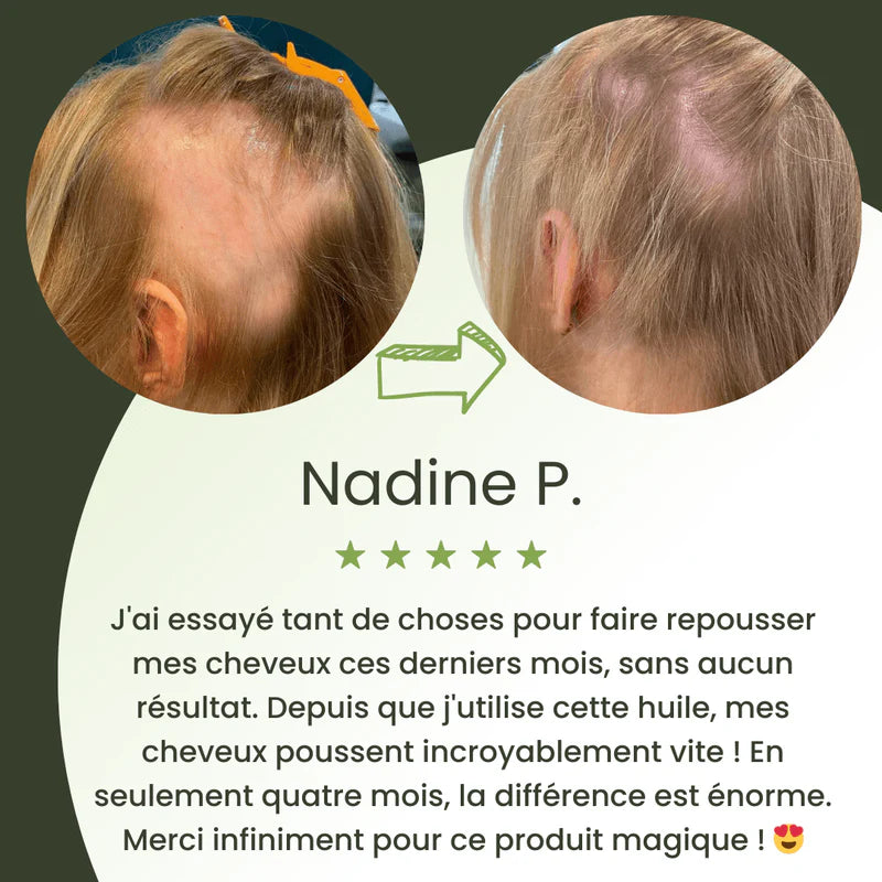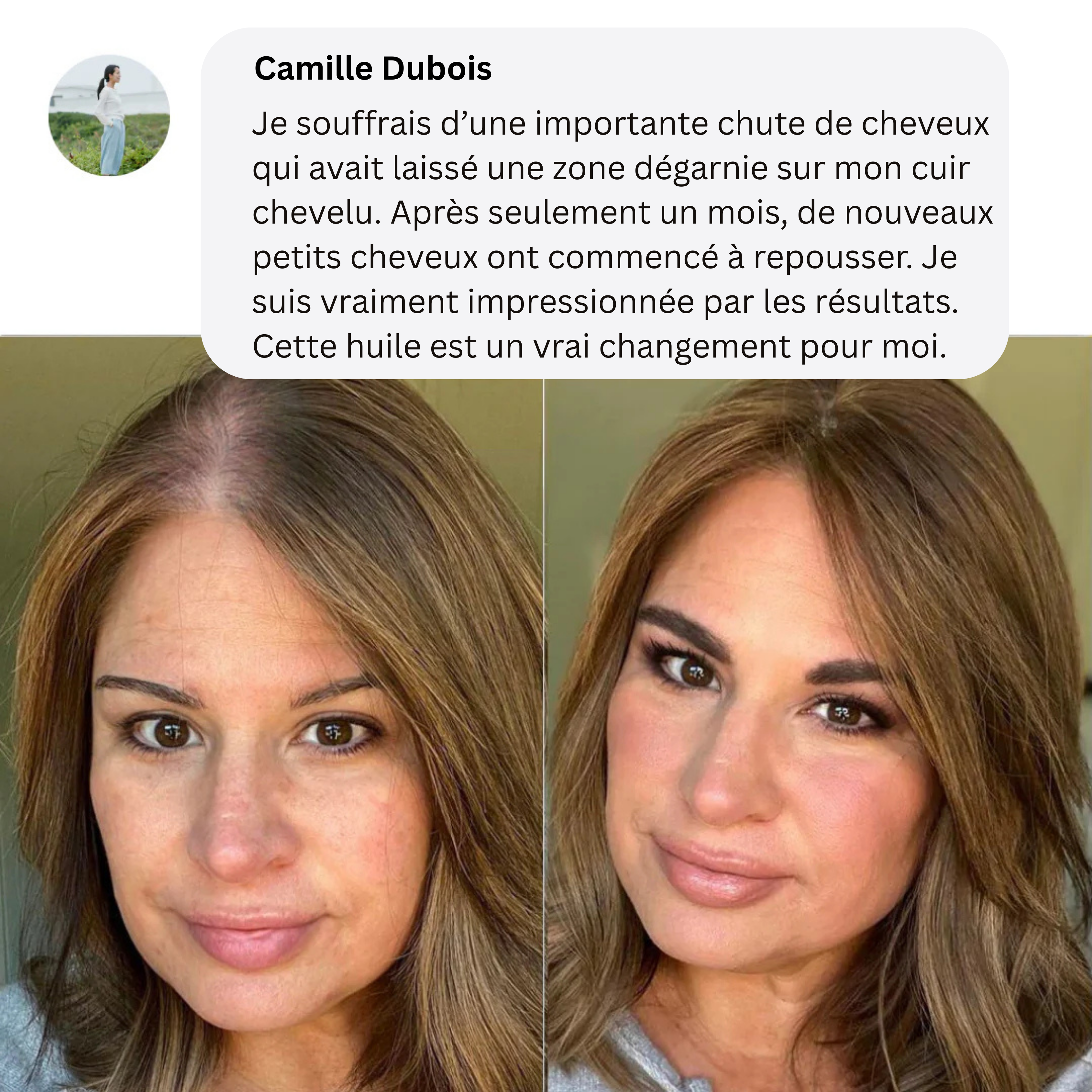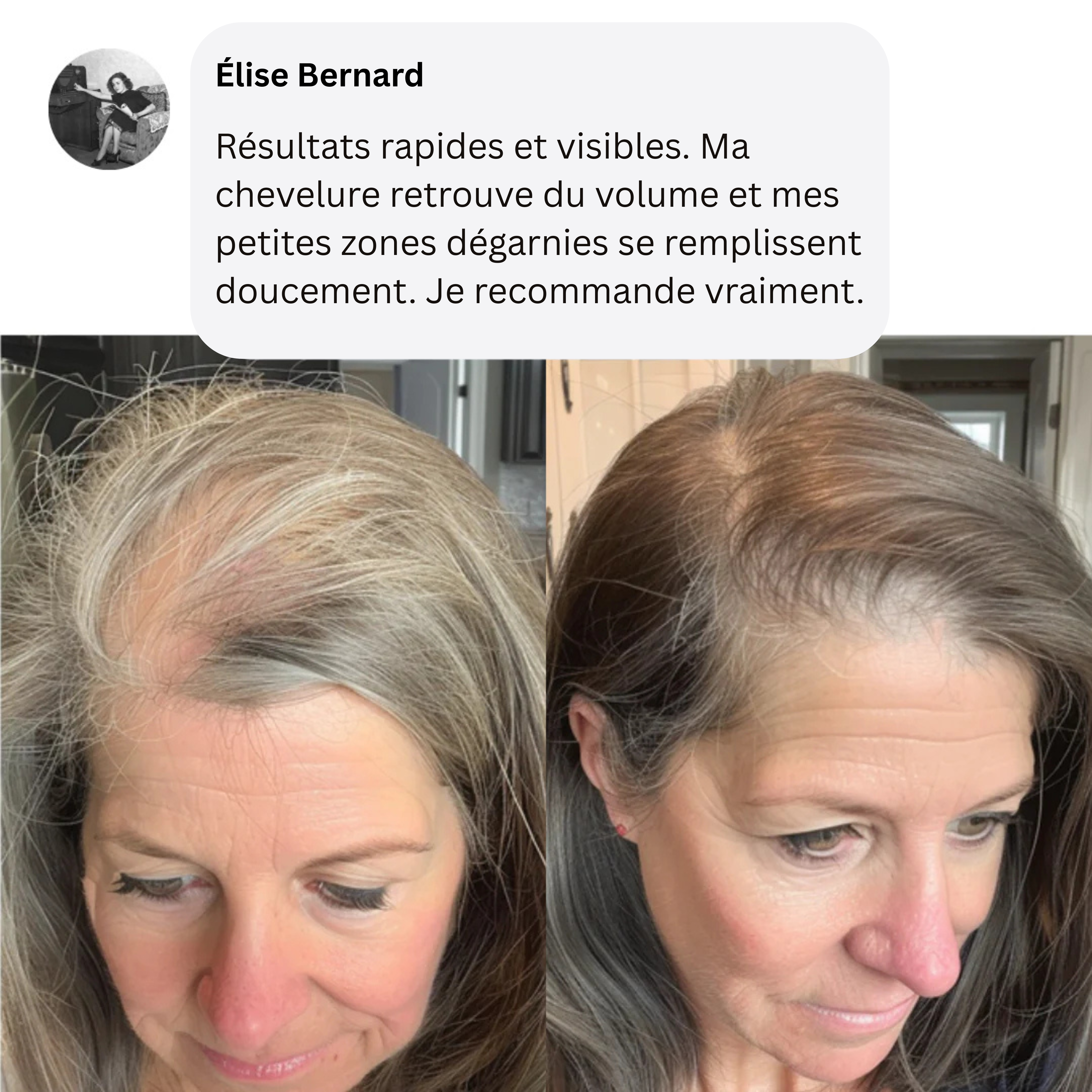 Dès les 4 premières semaines, la chute ralentit et vos cheveux reprennent vie. En 2 à 3 mois, les zones clairsemées commencent à se combler et votre chevelure gagne visiblement en brillance.