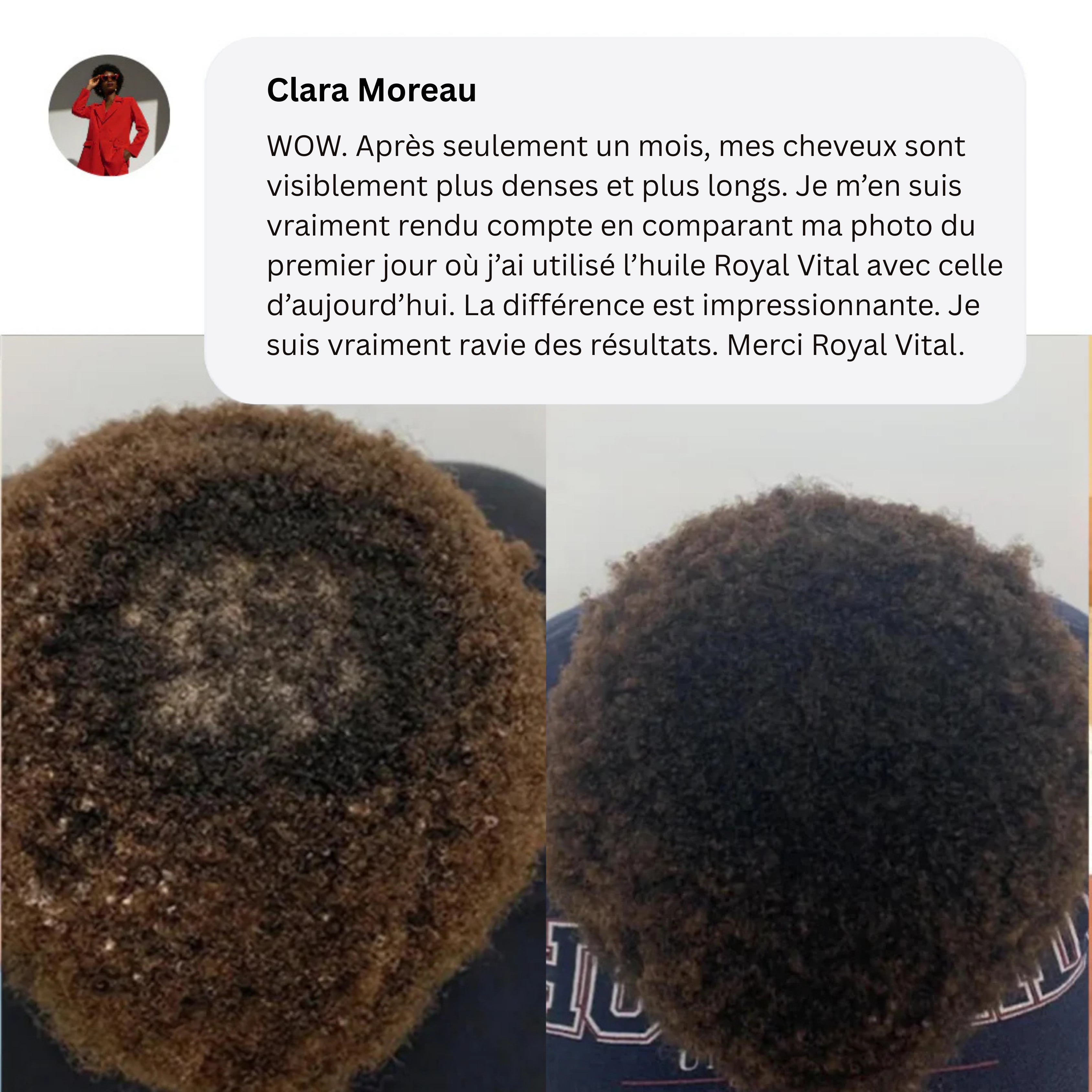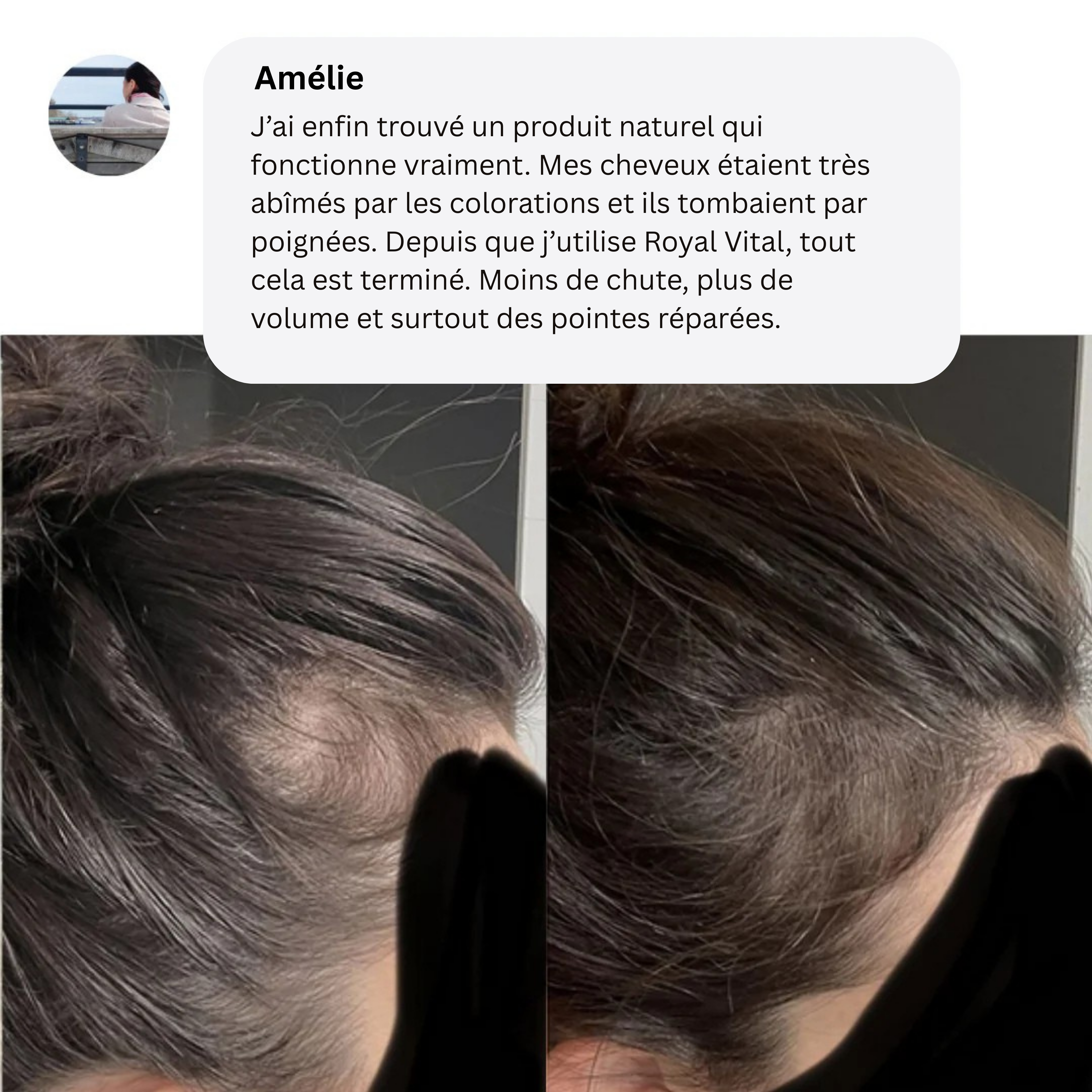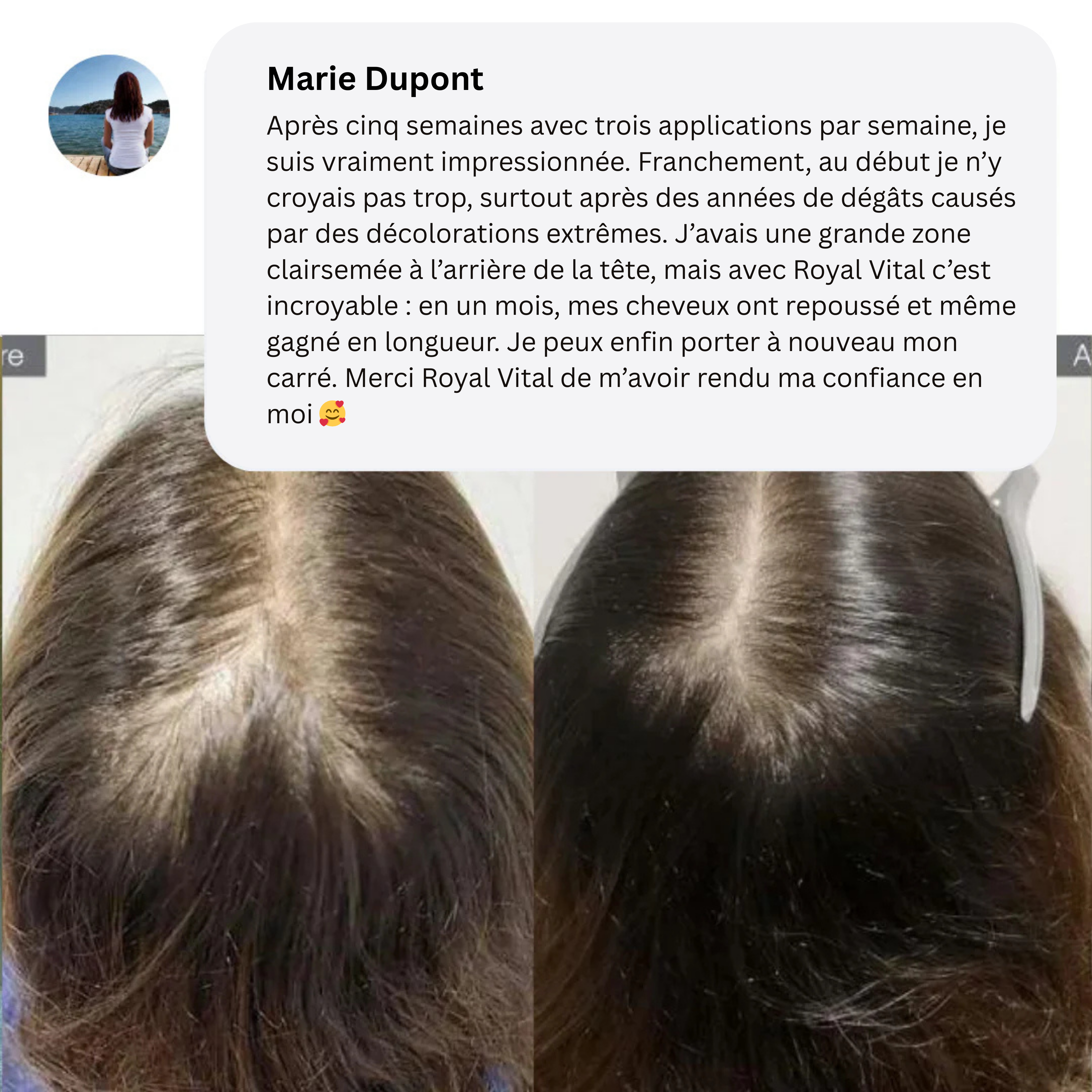 Dès les 4 premières semaines, la chute ralentit et vos cheveux reprennent vie. En 2 à 3 mois, les zones clairsemées commencent à se combler et votre chevelure gagne visiblement en brillance.