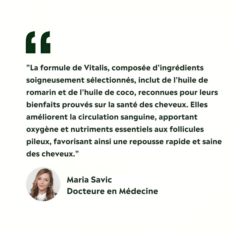 Vitalis agit directement à la racine. Grâce à sa synergie de 16 huiles naturelles, elle stimule le cuir chevelu, réactive les cheveux “endormis” et nourrit profondément les racines.